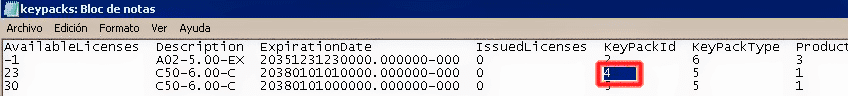 Seguidamente después de la ejecución, abriremos el archivo de texto para ver el KeyPackId del paquete de licencias que queremos eliminar de nuestro servidor.