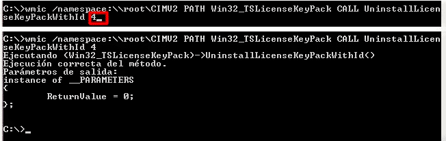 Como podemos ver en el ejemplo anterior, el número que escribiremos después de el parámetro UninstallLicensaKeyPackWithId indica el identificador de KeyPackId del paquete de licencias que queremos eliminar de nuestro servidor de Terminal Services.