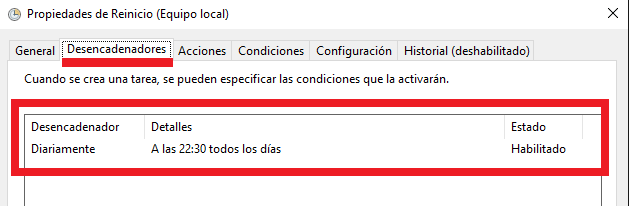 schtasks /create /ru system /rl highest /sc DAILY /tn Reinicio /tr "shutdown /r /f /t 0 /c "Reinicio"" /st 22:30 /F